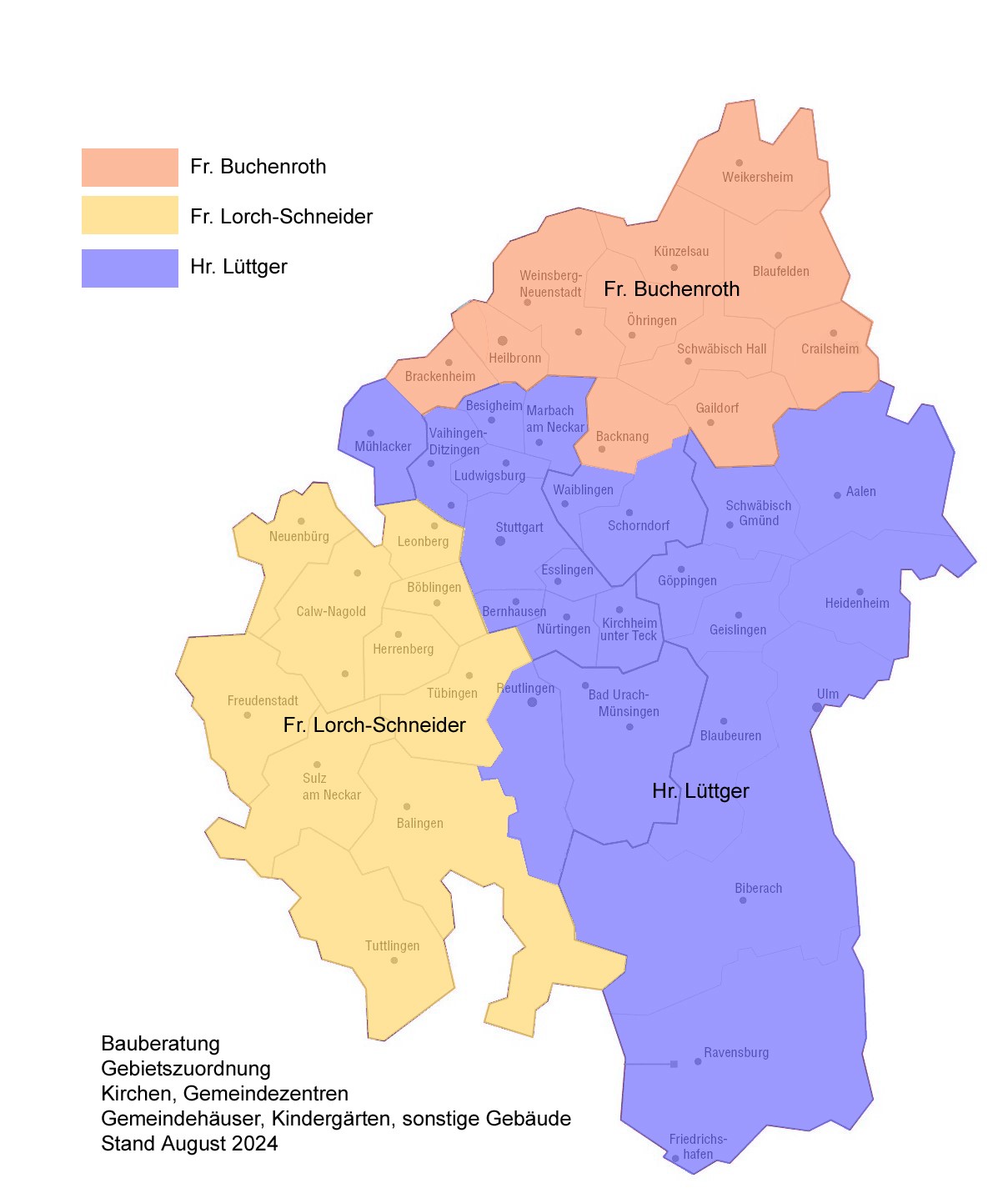 Die Bauberatung ist regional organisiert, jedoch gibt es für die Pfarrhäuser separate Zuständigkeiten. Auch die Energieberatung ist regional aufgeteilt. Die Zuständigkeiten entnehmen Sie bitte den Landkartenskizzen.