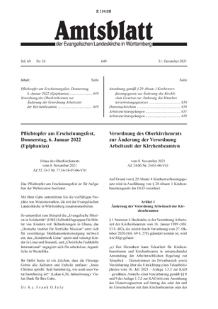 | Verordnung des Oberkirchenrats zur Änderung der Verordnung Arbeitszeit der Kirchenbeamten | Seite 649 | 01. Jan.. 2022 |