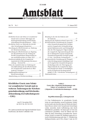 | Kirchliches Gesetz zum Schutz vor sexualisierter Gewalt und zu weiteren Änderungen der Kirchengemeindeordnung und Kirchenbezirksordnung (Gewaltschutzgesetz - GSG) |