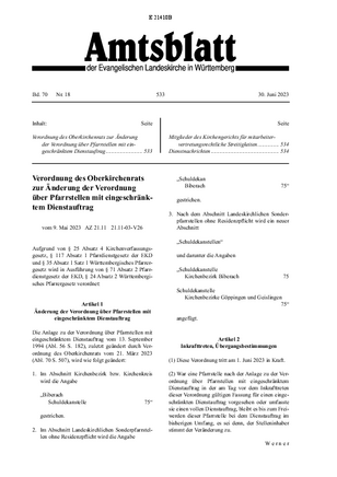 | Verordnung des Oberkirchenrats zur Änderung der Verordnung über Pfarrstellen mit eingeschränktem Dienstauftrag | Seite 533 | 09. Mai. 2023 |