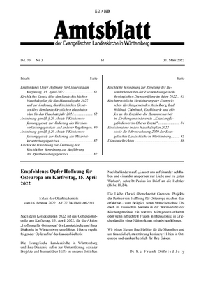 | Einsichtnahme in den Haushaltsplan 2022 sowie die Jahresrechnung 2020 der Evangelischen Landeskirche in Württemberg |